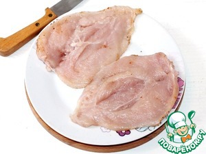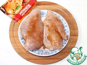 • 3. Промойте куриные грудки и обсушите бумажным полотенцем. Присыпьте приправой для курицы и солью.