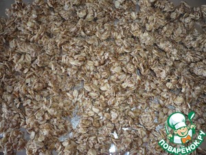 Теперь тонким слоем выложите смесь на противень застеленный фольгой, поставьте противень в духовку, разогретую до 180 градусов на 20 минут, время от времени доставая противень и перемешивая овсяную смесь, следите за тем, чтобы мюсли не подгорели.