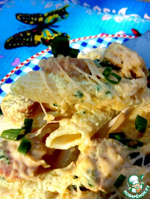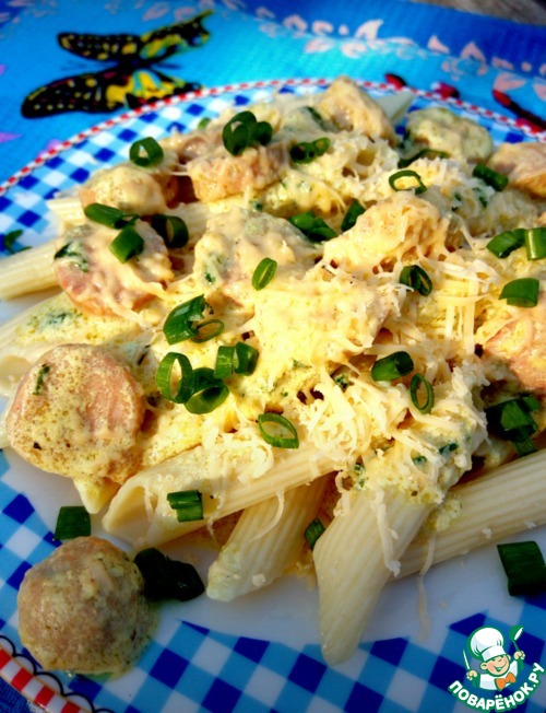 Готовым соусом поливаем макароны. Либо можно добавить макароны в сковороду соусу и прогреть вместе 1 минуту. Обязательно бильно посыпать тертым сыром.