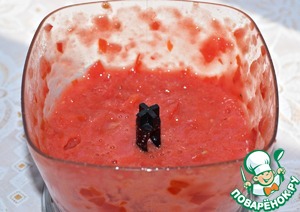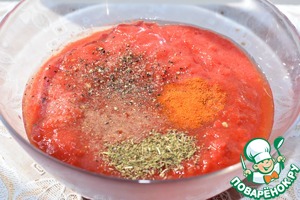 Добавить к помидорному пюре томатный сок, паприку, чабер, соль перец (специи по вашему желанию)