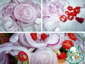 • Выложить салат на блюдо. Сверху горкой выложить тонко нарезанный лук. Украсить колечками перца чили.