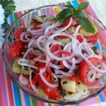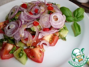 Предлагаю простой овощной салат с заправкой с грецкими орехами. Салат нежный, яркий, сочный, вкусный. Тонко нарезанный красный сладкий лук добавил особую нотку. За основу взят рецепт Алексея Онегина, автору огромное спасибо.