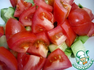 • Помидоры нарезать крупно и добавить к огурцам.
