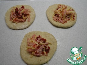 Шарики из теста раскатать в кружки диаметром 10-12 см. В центр выложить по 1 ст. л. начинки.