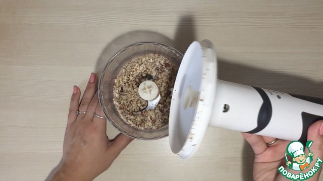 1. Орехи перемолоть несколько секунд в блендере до мелкой крошки.