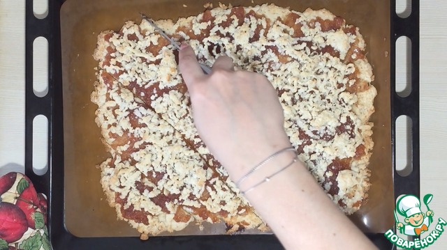 Распределить равномерно по противню тесто из холодильника.