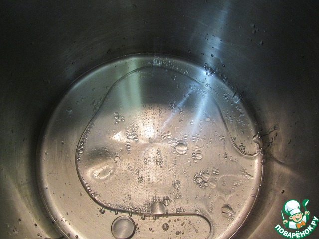 Начинаем готовить. Наливаем в кастрюлю, где будем готовить наш салат, растительное масло и воду. Даем закипеть.