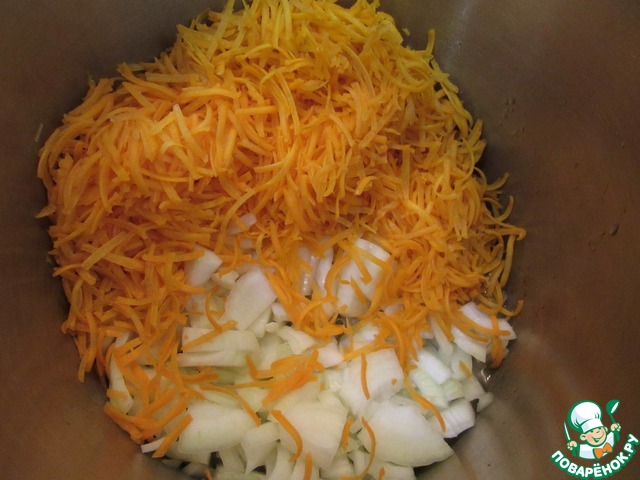 В закипевшую водно-масляную смесь выкладываем натертую на крупной терке морковь и, порезанный мелким кубиком, лук. Перемешиваем. Томим на среднем огне 10-15 минут, чтоб лук и морковь размягчились.