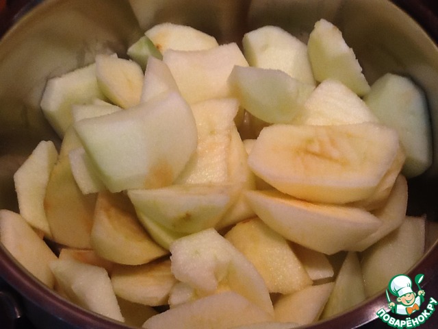 Сначала нам нужно очистить от кожицы и сердцевины 500 г яблок. Сложить их в сотейник и потушить с добавлением небольшого количества воды.
