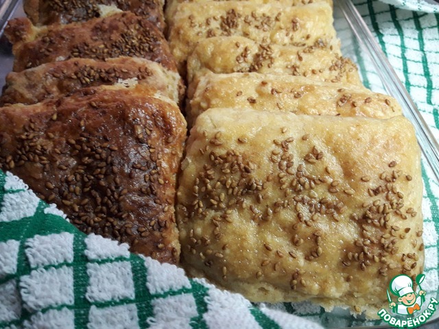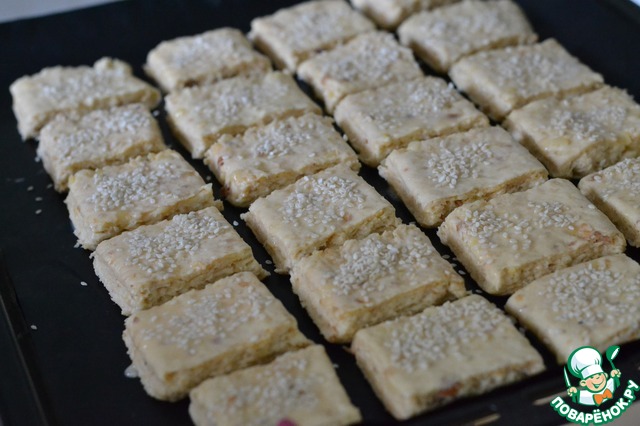 Смазать взбитым яйцом. Посыпать кунжутом.