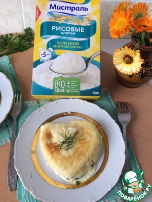 Рецепт омлета с использованием рисовых хлопьев "Мистраль". Готовить просто, а получается вкусно и сытно! Количество продуктов указано на 1 порцию.