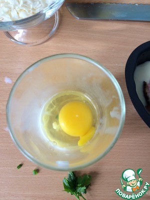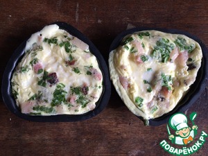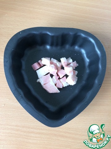 В порционную форму для запекания на дно выложить бекон, нарезанный кубиком, залить смесью и добавить мелко нарезанную зелень.