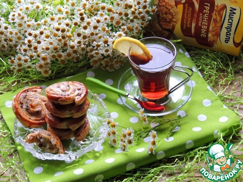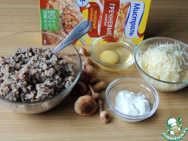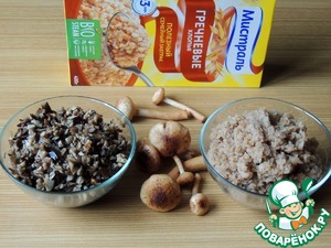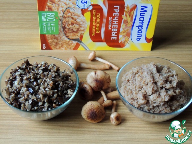 • Для начинки завитушек гречневые хлопья залить стаканом кипятка, оставить на 3 минуты. Грибы обжарить на растительном масле с луком и мелко порубить.