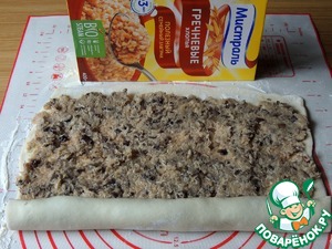• Тесто разморозить. Каждый пласт раскатать до увеличения площади вдвое. Распределить начинку и свернуть в рулеты.