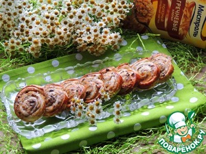 • Каждый рулет разрезать на кругляшки толщиной 1 см. Завитушки разложить на противень, застеленный бумагой для выпечки или силиконовым ковриком.