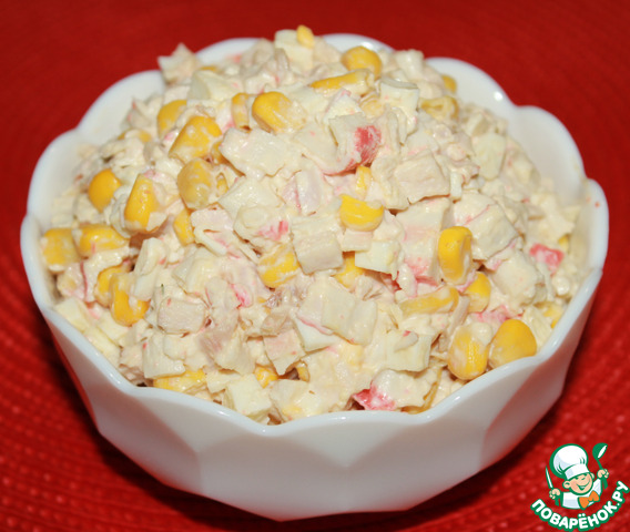 Кому то может показаться сочетание курицы с морепродуктами странным, но поверьте в салате все выходит очень гармонично. Нейтральный вкус куриного филе не мешает вкусу крабовых палочек и ничем не перебивает его, а только добавляет.
