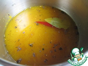 Вино и уксус смешать в отдельной посуде, посолить и слегка подсластить разбавленным сиропом. По желанию можно взять и просто сахар. Всё добавляйте по своему вкусу. Я взяла 1 ч. л. соли и 3 ч. л. разбавленного сиропа.