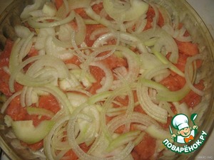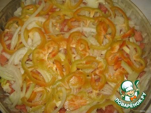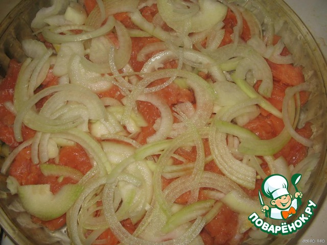 Слегка солим, перчим. Нарезаем лук полукольцами, укладываем на рыбку.