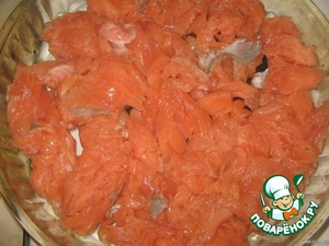 Филе горбуши нарезаем на кусочки, укладываем в форму.