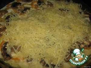 Через 15 минут посыпаем натёртым сыром и ставим обратно в духовку ещё минут на 10.