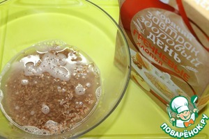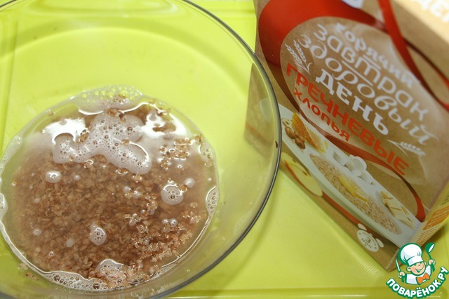 Гречневые хлопья залить горячей водой в соотношении 1:2, оставить до полного впитывания жидкости.