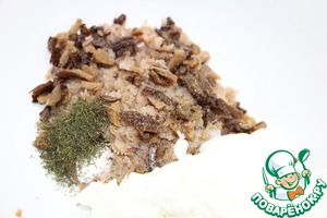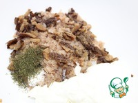 К хлопьям добавить мелкопорезанные грибы, добавить соль, сухой укроп, натуральный йогурт, можно питьевой.
