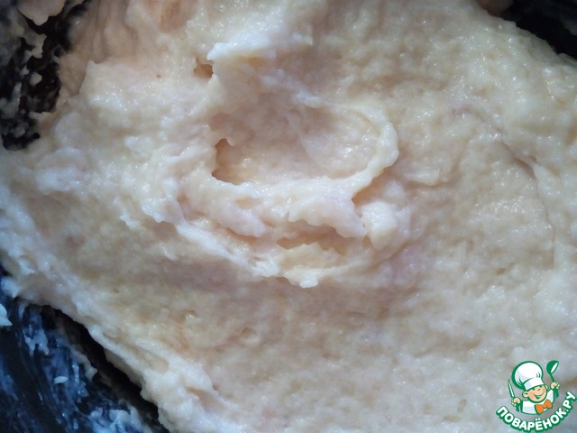 Соединяем яблочное пюре с курино-рисовой массой. Мне в этом опять помог блендер. Если "фарш" получается жидковат, можно добавить крахмал, предварительно растворённый в небольшом количестве воды, молока или сливок. Тщательно перемешиваем.