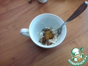 В кружку выкладываем фету и разминаем её вилкой, добавляем мёд и корицу. Соединяем.