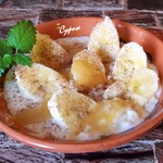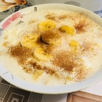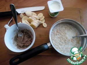 Каша сварилась и в неё сразу же выкладываем натуральный йогурт, перемешиваем. Выкладываем в кашу смесь из феты, мёда и корицы. Опять перемешиваем. Банан режем на кусочки. На 2 порции нам хватит одного банана или положите сколько вы любите.
