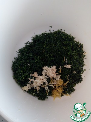 Укроп мелко рубим, чеснок пропускаем через чеснокодавку, смешиваем с цедрой и лимонным соком.