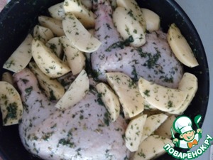 Картофель режем на 4 части, выкладываем в форму к окорочкам. Затем вводим соус и все тщательно перемешиваем. Запекаем в духовке при 200° около 40 минут.