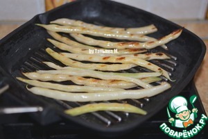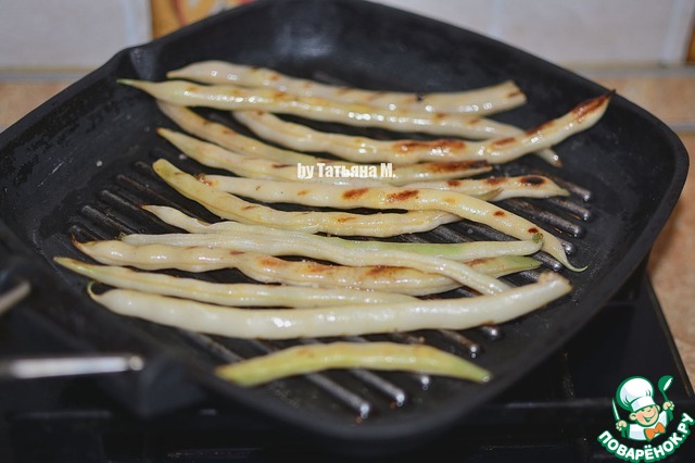 Разогреть гриль-сковороду, чуть смазать маслом, обжарить стручки фасоли (при желании можно их чуть присолить, я не солила, так как соус достаточно соленый);