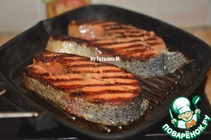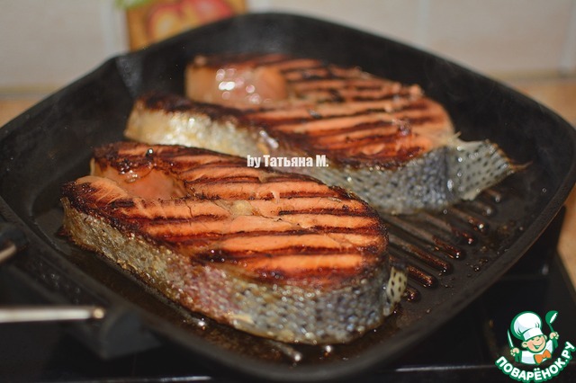 Затем обжарить семгу с обоих сторон (если куски крупные, и вам кажется, что середина не готова, то после обжарки доготовить семгу в микроволновке 1,5-2 минуты на максимальной мощности);
