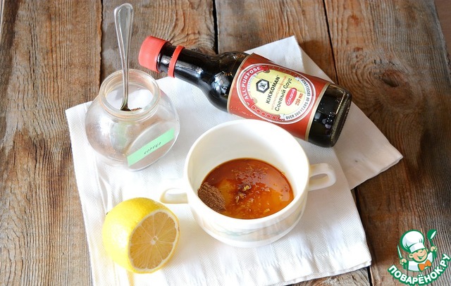 Смешайте мед, сладкий соевый соус Киккоман, добавьте лимонную цедру и корицу