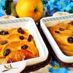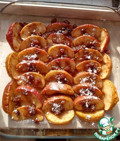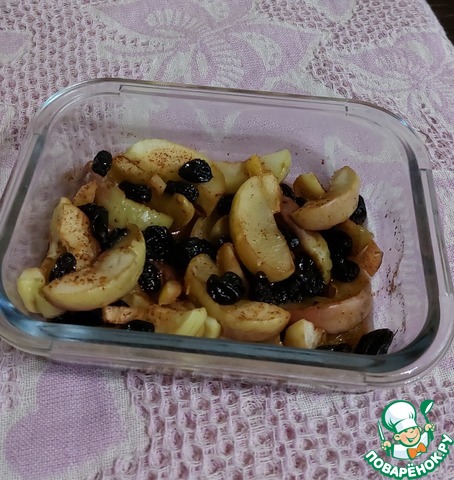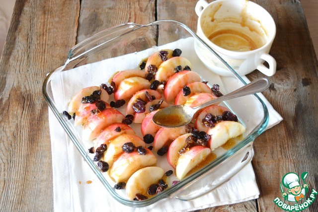 • В любую форму, подходящую для микроволновой печи положите дольки яблок и изюм. Полейте медовой смесью.