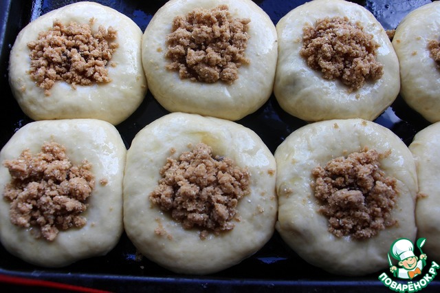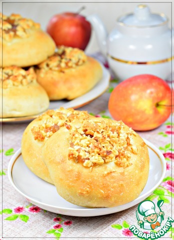 Разделать тесто на небольшие булочки. Каждую раскатать в лепешку, на середину положить яблочную начинку.