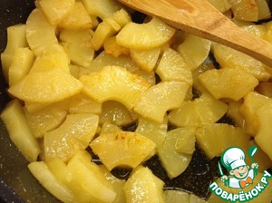 Кольца ананасов нарезать на четвертинки и обжарить на оливковом масле. Приправить жгучим красным перем. -