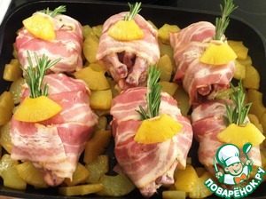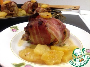 Каждого рябчика запеленать в ломтики бекона. Он не даст пересушить нежное мясо рябчика. Воткнуть по веточке розмарина, можно по 1/2 веточки, розмарин яркая специя. Подготовленные рябчики украсить по кусочку ананаса.
