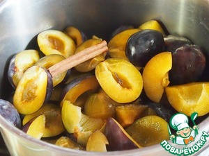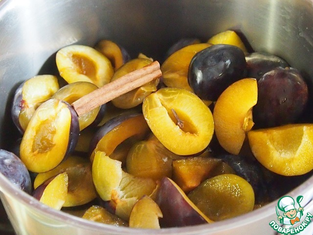 Вынуть из кастрюли корицу. Мягкие сливы в кастрюле измельчить блендером, насыпать сахар и поварить до его растворения. Количество сахара зависит от кислоты слив и ваших предпочтений, поэтому здесь нужно попробовать на сахар и немного добавить при необходимости. В сливы влить струйкой растворенный пудинг и, постоянно помешивая, сварить до загустения. Это длится минуты 4-5, выключить огонь.