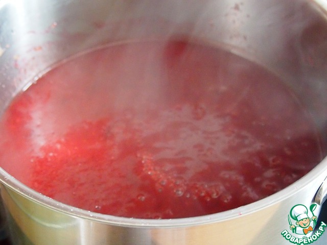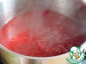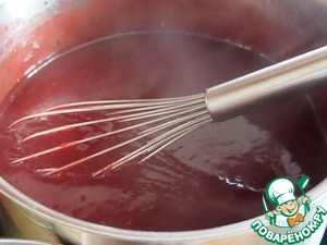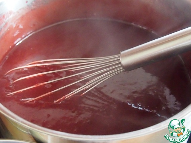 Затем желатиновую смесь влить к остальным сливам и хорошенько перемешать метлой для взбивания. Затем, периодически, помешивая, остудить начинку. Это самое длительное время всего процесса. Для сокращения времении начинку можно приготовить в первую очередь, а уже потом заниматься тестом. Начинка приобретает насыщенный бордовый цвет, хотя он тоже зависит от сорта слив.