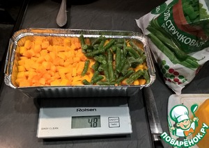 Тыкву очищаем и режем на такие же маленькие кусочки (можно потереть на терке), выкладываем на филе, сверху - немного оттаявшую замороженную фасоль.