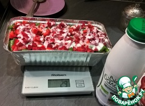 На фасоль - кусочки сладкого перца (с красным красивее :) ). Слои по вкусу можно немного присаливать. На перец сверху равномерно выливаем обезжиренный кефир (можно несладкий йогурт или сметанку, в моем варианте это пока вместо сыра, который обожаю, но...), и можно снова присыпать любимыми сушеными травками.