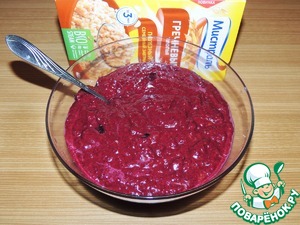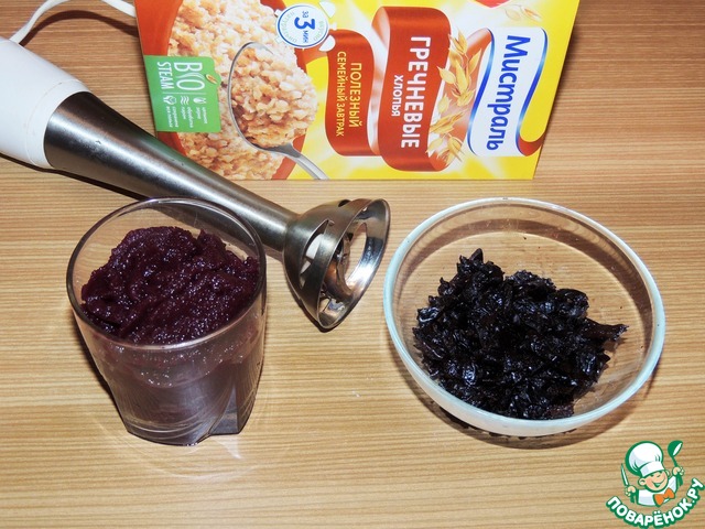• Свеклу очистить и измельчить блендером (получается около стакана пюре). Чернослив порезать сантиметровыми кубиками.