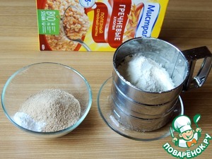 Гречневые хлопья смолоть в кофемолке до состояния муки. Смешать и просеять гречневую и пшеничную муку и соду.