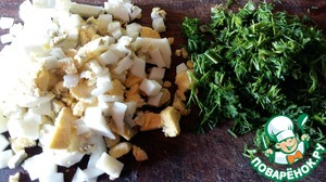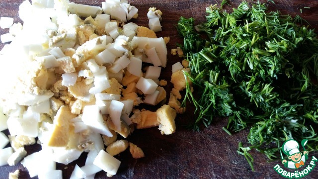 Яйца сварить и нарезать мелким кубиком, укроп измельчить.