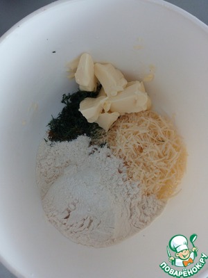 • Мягкое масло, сыр натертый на мелкой терке, мелко нарубленный укроп и муку, соединяем вместе и перемешиваем.