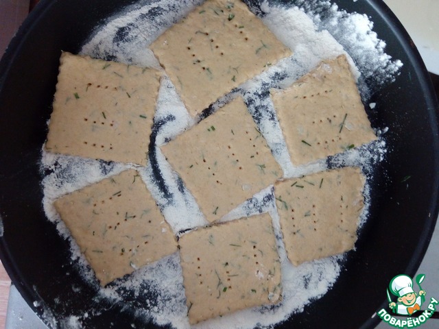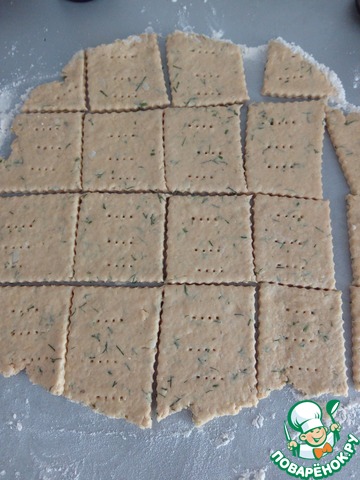 Тесто раскатываем не очень тонко, разрезаем на квадраты, прокалываем вилкой.