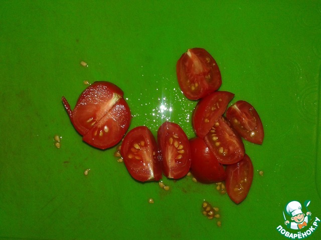 Лук порезать полукольцами (опять же из - того что брала помидоры черрики, я и маленький лук беру (резала кольцами), оно гармонично выглядит, )