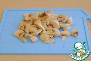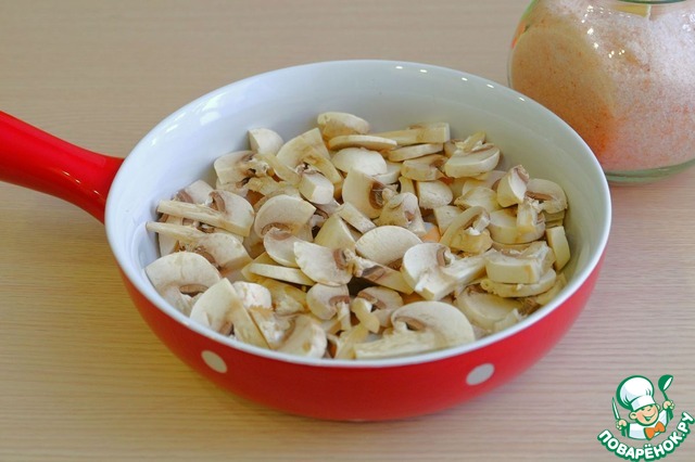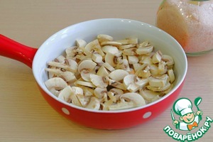 Яично-сливочную смесь добавить в форму для запекания. Смесь должна слегка покрывать шампиньоны.