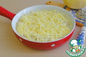 Сыр натереть на терке. В форму для запекания добавить натертую сырную соломку. Форму поместить в разогретый духовой шкаф. Запекать до готовности. Температурный режим и время запекания каждый выбирает самостоятельно, ориентируясь на возможности своей духовки. На гарнир можно подать жареный или отварной картофель.